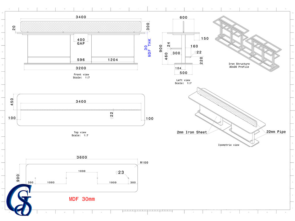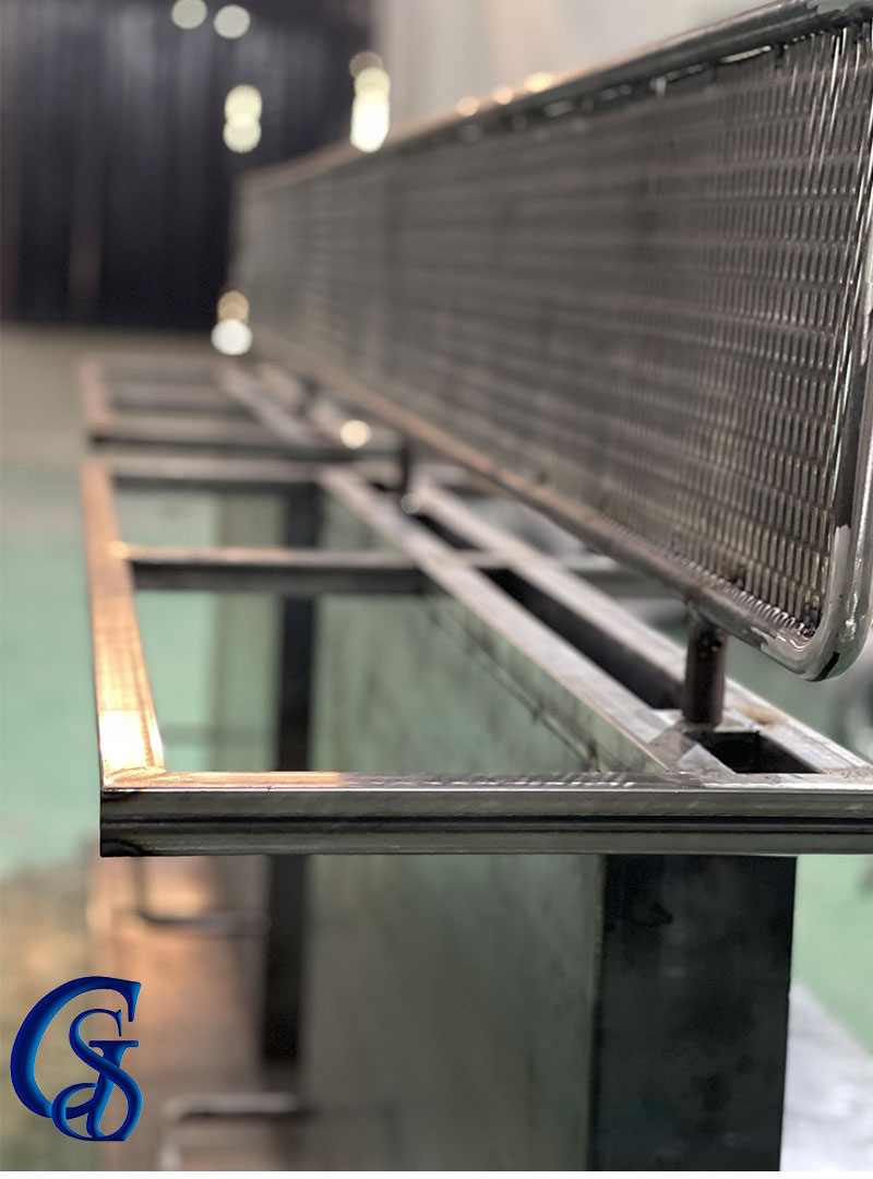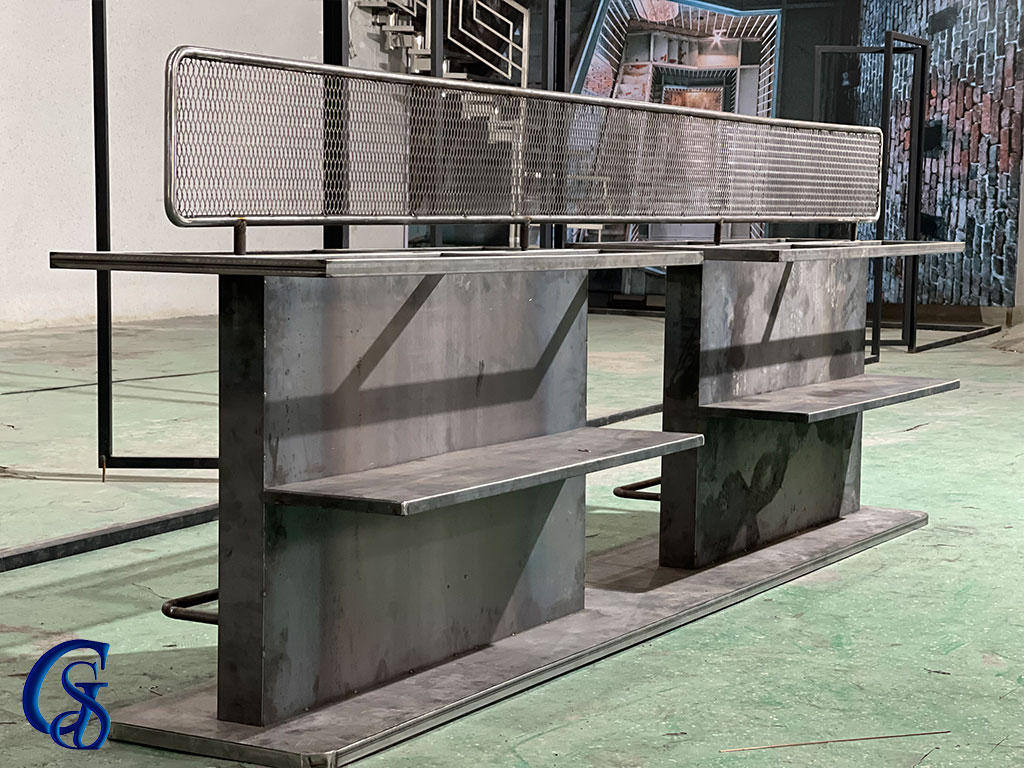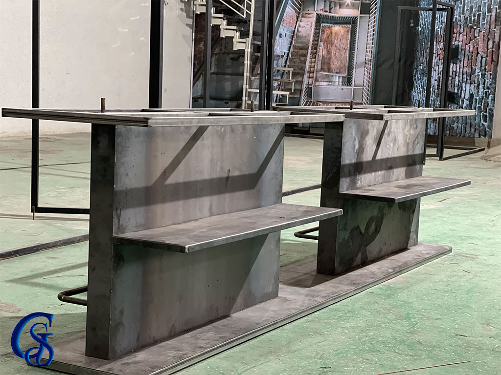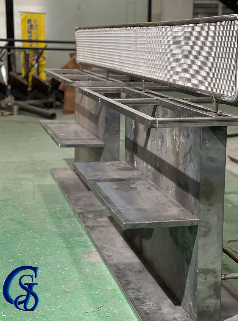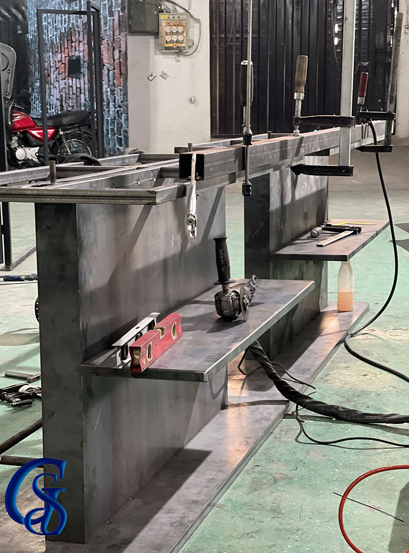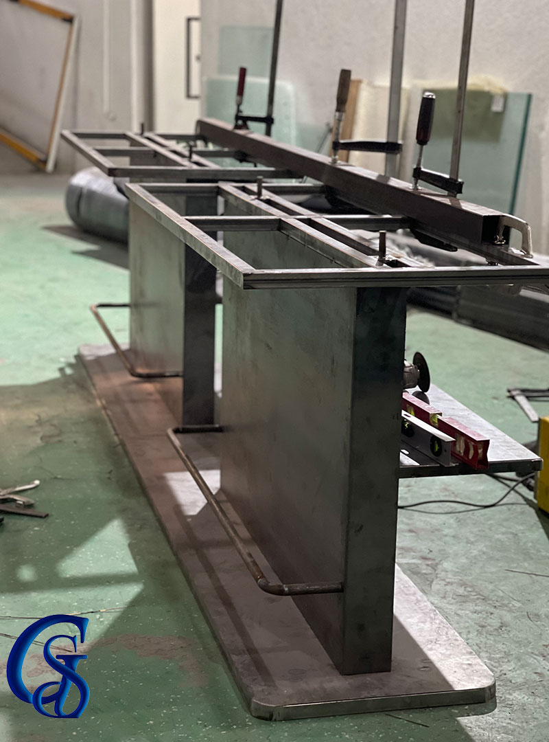 برای جابجایی میز، یک طرف از فوت ریل (لوله فولادی) به سازه اصلی (ستون زیر سازی) متصل شده و از طرف دیگر با ورق فولادی با خم و شیارهای کامل محاسبه شده به سازه اصلی کلاف شده است.