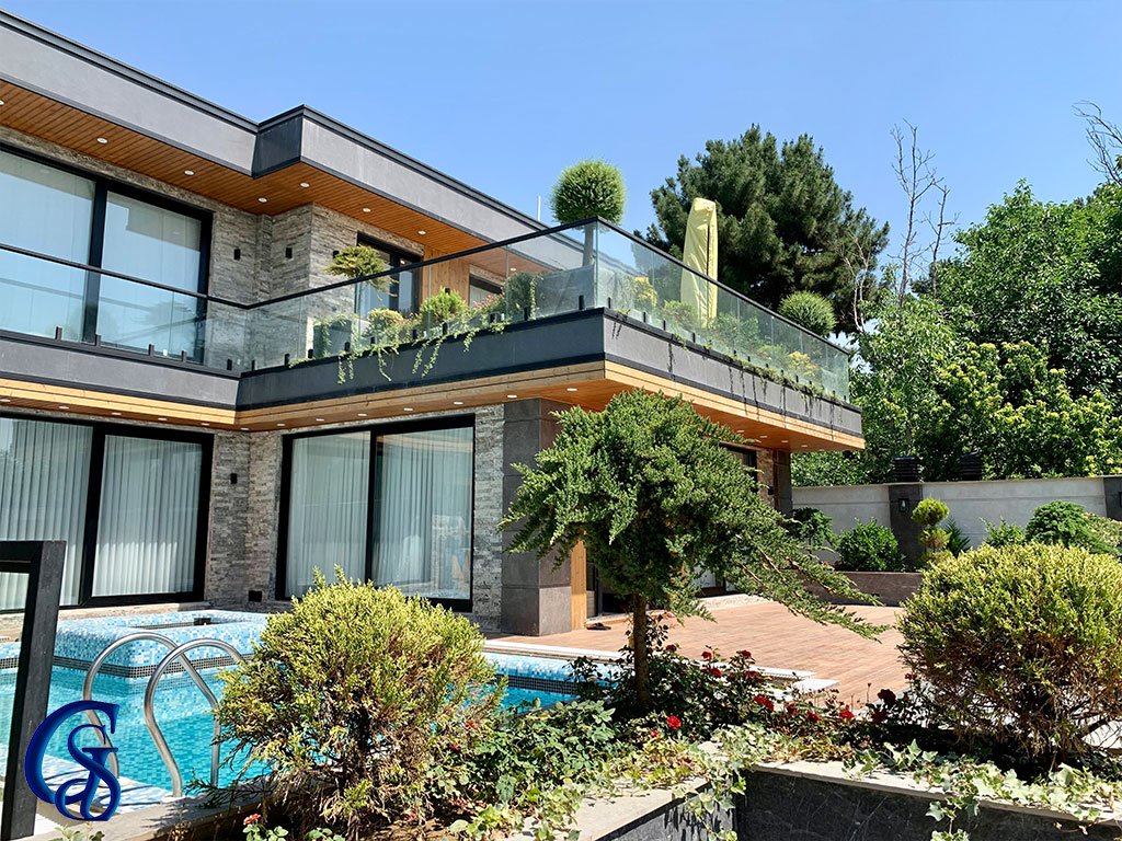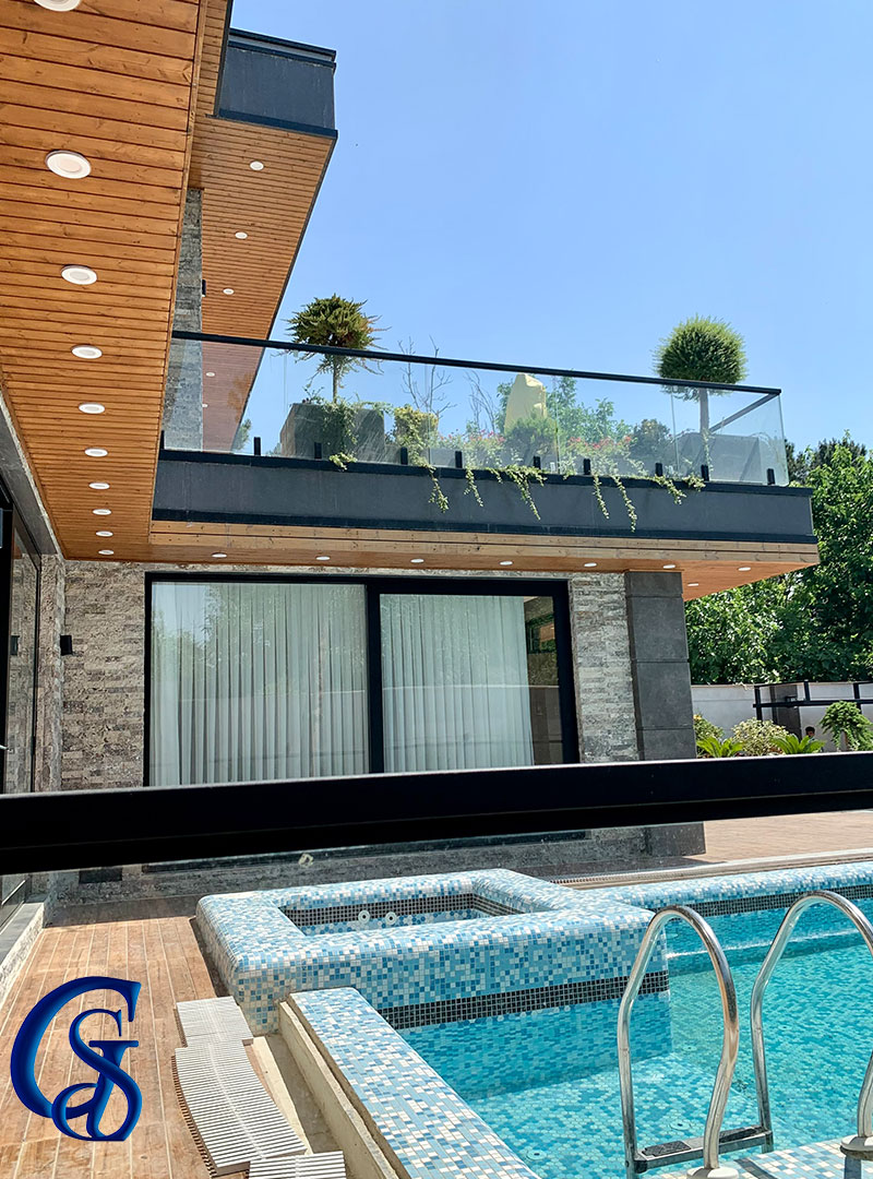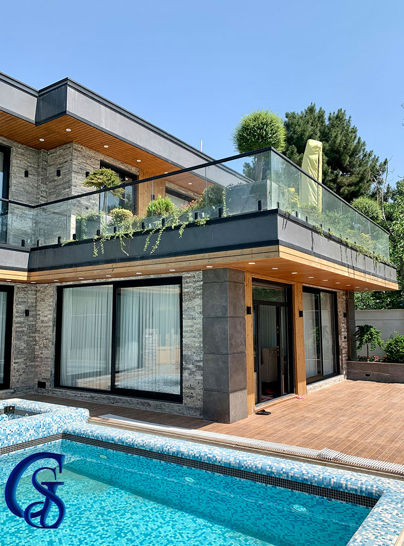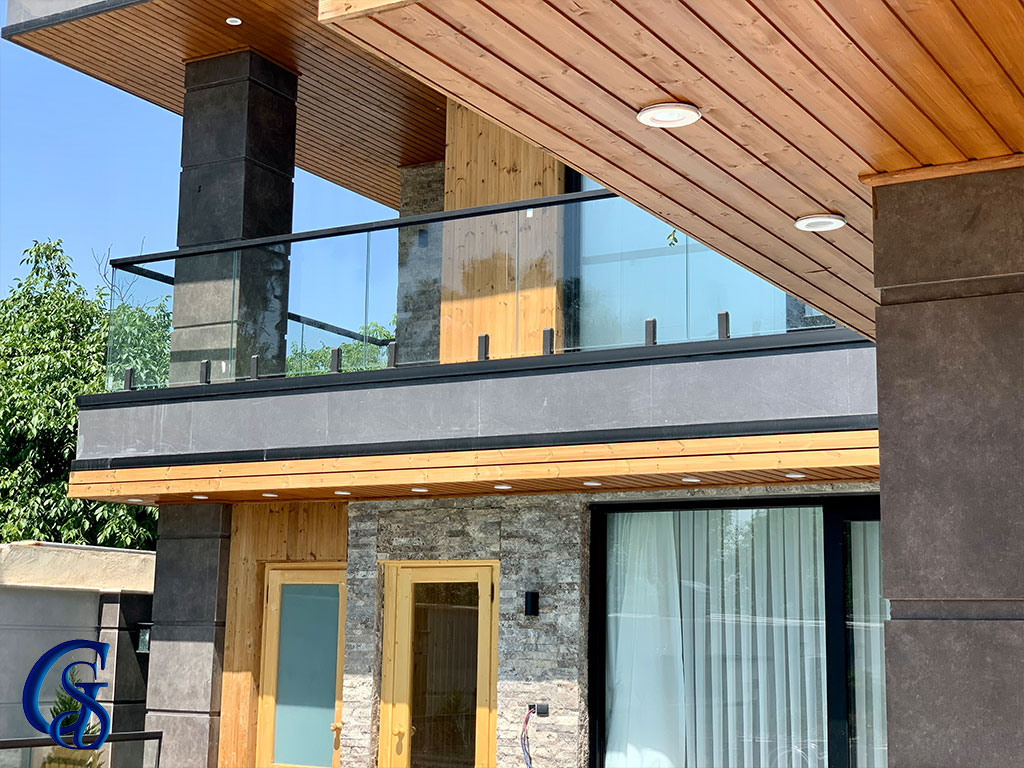 طراحی نردههای بیرونی (جانپناه تراس و محوطه حیاط) به گونهای انجام گرفته است که با طراحی کلی نما کاملاً همسو و یکپارچه باشد. علاوه بر نردههای شیشهای لمینت شده ( ۲ لایه ۶ میل) علاوه بر استحکام و مقاومت بالا و تامین ۱۰۰% امنیت جانی به واسطه پایههای نگهدارنده اسپیگت شیشه برند GS و اجرای هندریل کلاف شده تا هم نمای این عمارت باشکوه و هم منظره بیرون ساختمان ( ویو) در یک قاب جذاب و بدون مزاحمت بصری (پایه،ستون،اتصالات) از هر جای عمارت قابل رویت باشد و برای لذت بردن از فضای حیات و بیرون عمارت نیازی به ایستادن نیست.